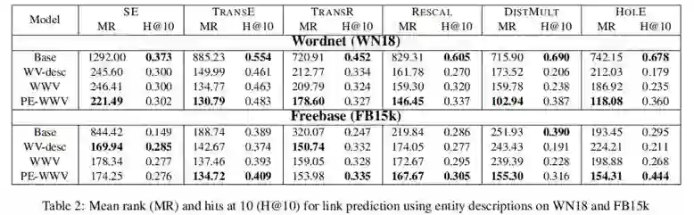 在本节中,我们评估了在Freebase[Bollacker等人,2008]和Wordnet[Miller,1995]的标准子集上提出的嵌入增强方法。我们将这些方法应用于表1中的每个评分函数,证明了它们增强现有嵌入模型的能力。我们首先将链路预测任务中的WWV和PE-WWV模型与包含实体描述的替代方法进行定量比较,然后定性地检查WWV模型,以更好地了解其性能。接下来,我们将FeatureSum模型与使用非结构化文本语料库的替代方法进行比较。