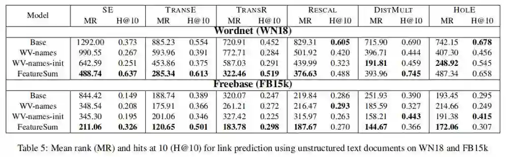 两个数据集的结果见表5。注意,这些结果不能直接与表2进行比较,因为这两组实验使用不同的文本数据。应该在同一个表中跨行进行比较。在这样做时,Wordnet上的平均秩通常表明,仅对实体名称应用WV已经给出了显著的改进,而使用word2vec向量初始化则进一步改进了结果,如[Socher等人,2013]所建议的。对于hits@10,结果是好坏参半的,WVnames方法在某些情况下显示出优势,而在其他情况下则显示出损失。