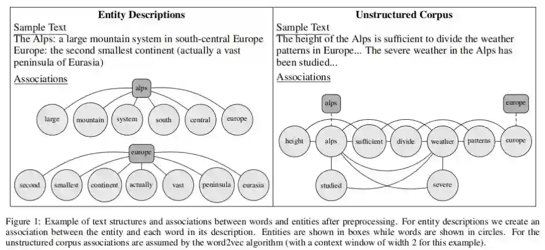 在本节中,作者将讨论将文本数据合并到知识图谱嵌入中的新方法。此附加信息允许培训过程学习同时从知识库和相关文本中反映事实的实体表示。根据可用文本数据的形式,我们考虑两种不同的场景:在第一种场景中,每个实体都有一个与之相关的文档来描述或定义实体;例如,欧洲的维基百科条目。这些数据可以从许多来源获得,包括百科全书或字典。在第二个场景中,我们考虑一个非结构化的语料库,它不直接链接到任何实体,但包含在任意位置的实体。例如,一篇提到欧洲的新闻文章可能是这个语料库的一部分。对本文的组织结构没有任何假设,因此它通常可以是从多个文档中收集的句子的集合。这两种形式的数据之间的关键区别在于,在前者中,实体是文档中所有单词的基础主题,而在后者中,实体只是包含未知主题的混合文档中提到的对象。结果,第一种情况包含每个单词以某种方式与已知实体相关的附加信息。对于第二种情况,我们只假设在相同上下文中出现的单词之间存在关联。这一区别如图1所示。