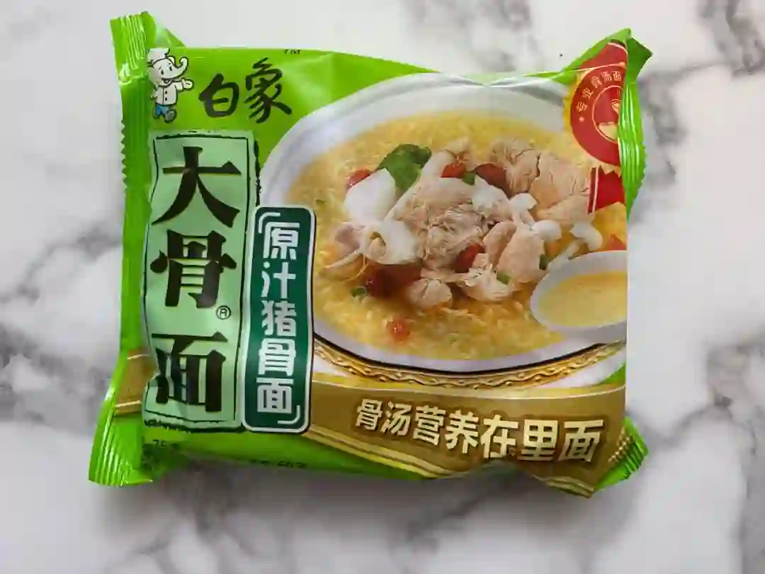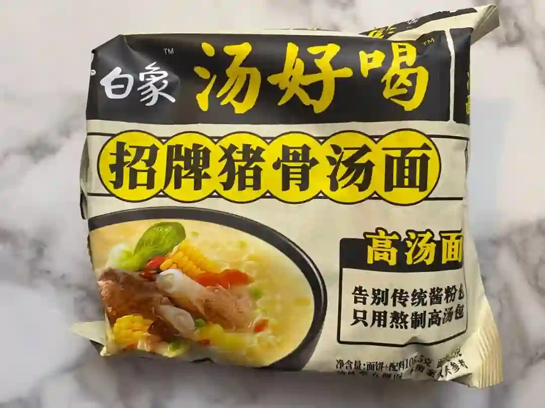 虽然很入味,但说实话,汤和猪骨还是真的没有什么很大的关系……味道也很复古,感觉像小时候吃过的简约版方便面,比起这次测评的其它白象来说,这个面也感觉没那么劲道。