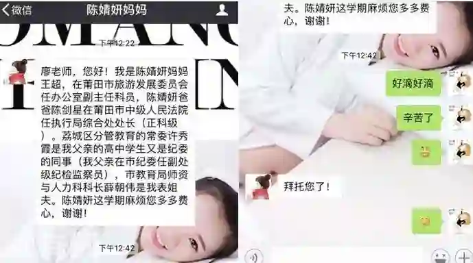 在向女儿学校老师做自我介绍的微信对话里,她不光详细报出了自己的工作单位和职位,还列举了家里所有在政府部门工作的亲戚,甚至连勉强能攀得上关系的“父亲的高中学生”都包括了,只因为此人在区里分管教育。