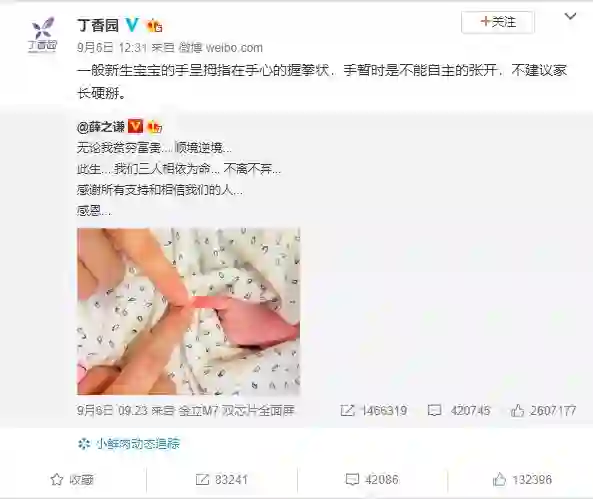 而在所有留言中,画风最清奇的来自健康科普大号“丁香园”:“一般新生宝宝的手呈拇指在手心的握拳状,手暂时是不能自主的张开,不建议家长硬掰。”而在薛之谦分享的图片中,小婴儿的整根食指通红,有网友因此调侃薛之谦为了秀恩爱而不择手“断”。这也引发了薛之谦粉丝的极大不满,他们随后对“丁香园”进行了大肆举报、攻击,转发丁香园评论的法医秦明等微博也遭到了同样的待遇。
