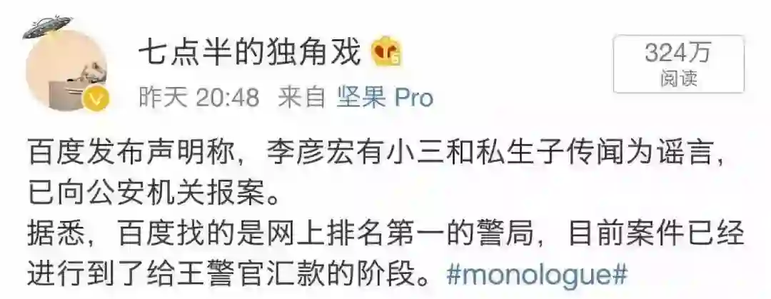 “百度发布声明称,李彦宏有小三和私生子传闻为谣言,已向公安机关报案。据悉,百度找的是网上排名第一的警局,目前案件已经进行到了给王警官汇款的阶段。#monologue#”