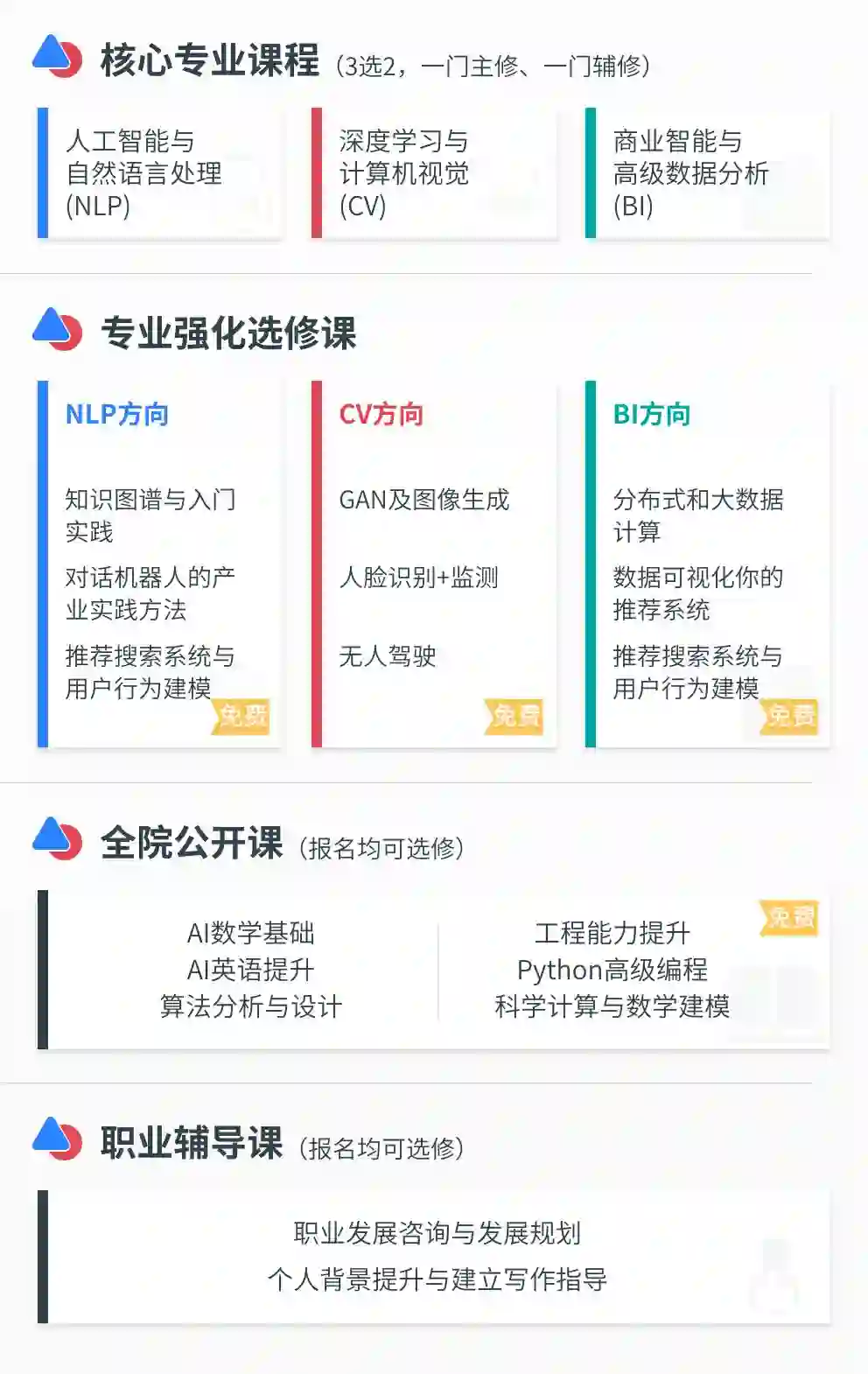 为满足不同基础学员需求,更有丰富的人工智能专业选修课及全院公开课帮助学员全面提升。