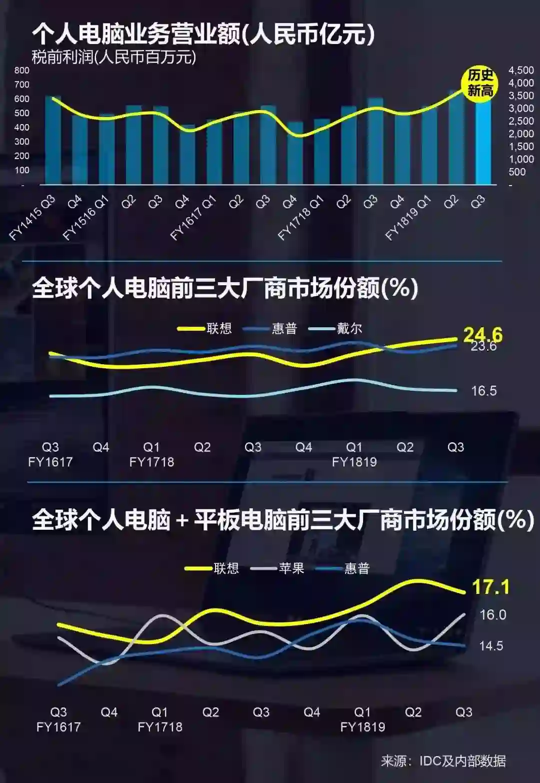 个人电脑业务实现了创纪录的营业额和利润,营业额年比年增速达16%,超出大市17个百分点,税前利润率也改善了1个百分点。联想集团在全球PC市场份额达到24.6%,创下历史新高;PC+平板市场份额超过17%,在这两大市场都取得了冠军位置。