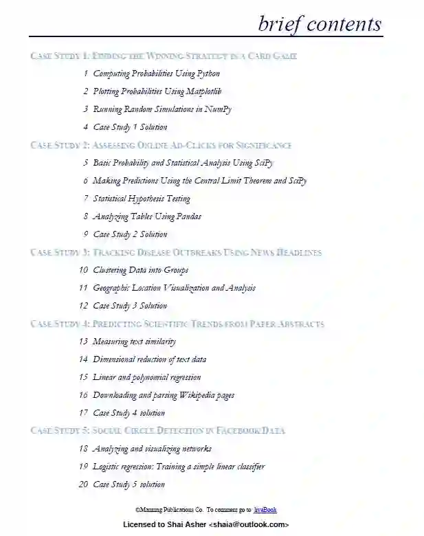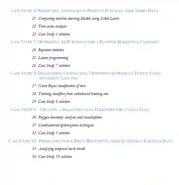 开放式解决问题的能力对于数据科学职业来说是必不可少的。不幸的是,这些能力不能通过阅读来获得。要成为一个问题解决者,你必须坚持解决困难的问题。带着这种想法,我的书围绕着案例研究展开:以真实世界为模型的开放式问题。案例研究范围从在线广告分析到使用新闻数据跟踪疾病暴发。