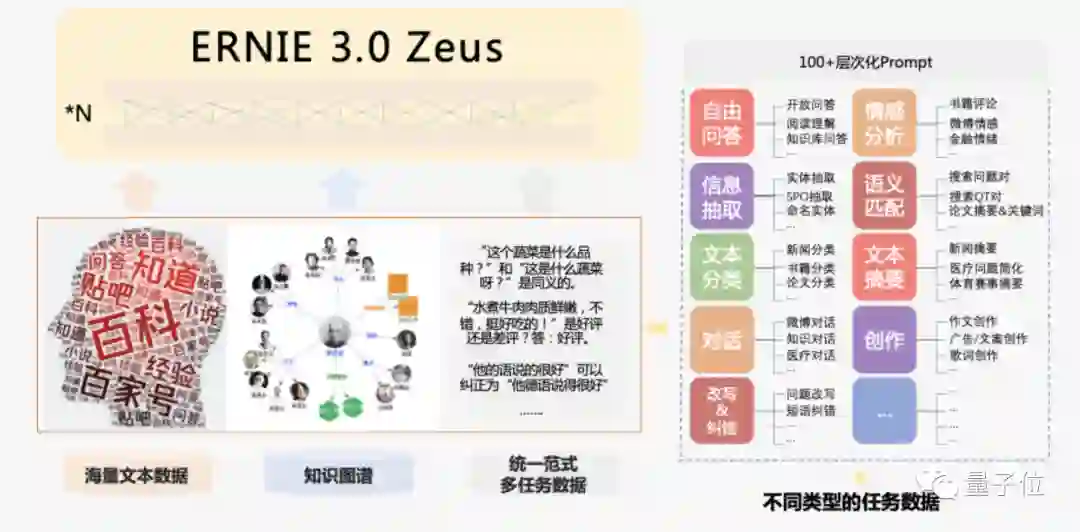除此之外,ERNIE 3.0 Zeus层次化提示(Prompt)学习技术,通过层次化的Text Prompt库将百余种不同的任务统一组织成自然语言的形式,和海量无监督文本以及百度知识图谱联合学习。