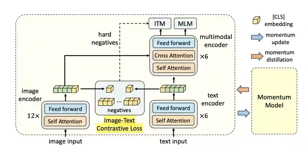从图中可以清晰地看到模型的结构,图片和文本分为“双流”分别处理。这里为了减小图片特征和文本特征的差异,作者采用基于Transformer的ViT提取图片特征,而不是传统的基于CNN的模型,这也得益于最近CV届对Transformer解决视觉问题对探索。作者在文本方面依旧采用了颇为传统的BERT,有趣的是原本12层的BERT在这里做了分割,前6层作为单模态处理阶段(text encoder),后6层放到了多模态处理阶段(multimodal encoder)。在多模态处理阶段,文本每层先通过self-attention,再通过cross-attention和视觉特征相融合。