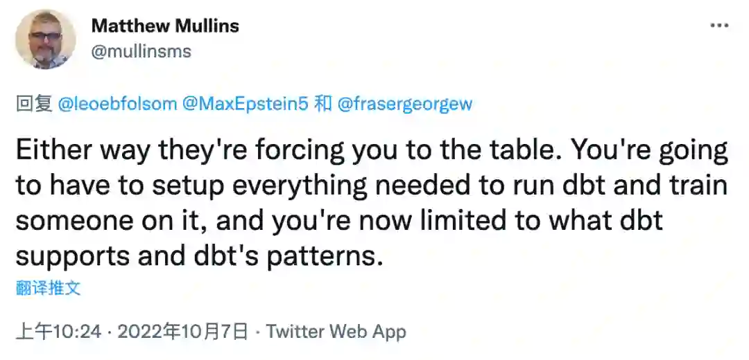 不过,近日一位 Twitter 博主、也是数据分析平台 Cogniti 的首席技术官@Matthew Mullins 突然发了一条推文,他写道,“Fivetran 放弃支持 SQL,并强迫用户转向 dbt。但你可能会因为更为“现代化”而喜欢它。”