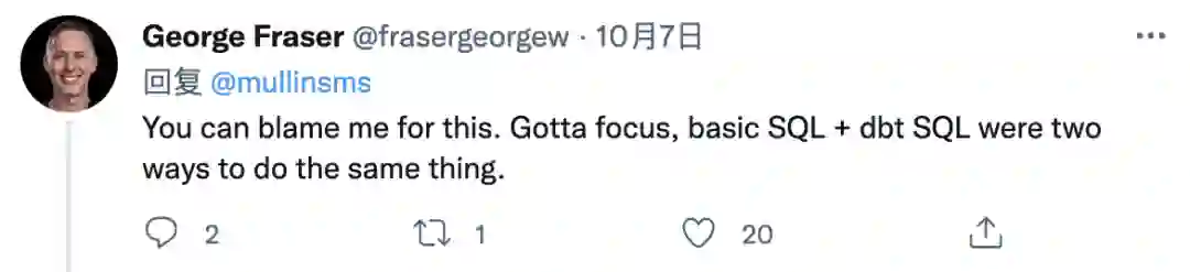 在这条极具争议的推文下方,Fivetran 的 CEO George Fraser 也迅速现身进行了回应,“你可以为这件事责备我。必须集中精力,Basic SQL 和 dbt SQL 实际是做同一件事的两种方法”。同时,他也表示 Fivetran 也正在努力降低扫清采用 dbt 的障碍。