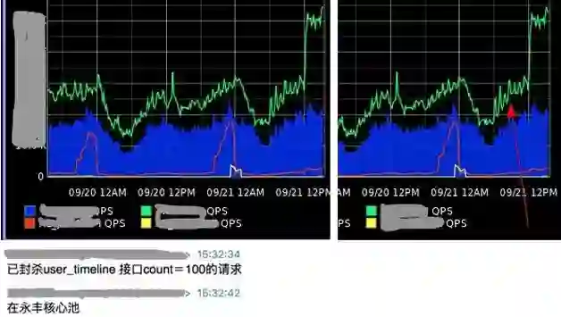 从字面意思可以看出,限流的目的就是为了防止恶意请求(如刷站)、恶意攻击,或者防止流量超出系统的峰值。处理的原则就是限制流量穿透到后端的资源,保障资源的可用性。举个例子:比如图13的QPS异常现象,请求流量超出平时晚高峰的好几倍,严重影响了服务的稳定性和后端DB的承载能力,为了保障DB资源的可用性,经排查是属于通过user_timeline接口的恶意刷站行为,此时,我们要做的就是封杀该接口,限制流量穿透到DB层,封杀后,效果很明显。