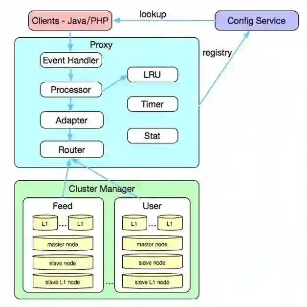 其中,Master是主缓存节点,Slave是备份节点,当Master缓存失效或实例挂掉后,数据还能够从Slave节点获取,避免穿透到后端DB资源,L1主要用来抗住热点的访问,它的容量一般比Master要小,平台的业务通常部署多组L1,方便进行水平扩容以支撑更高的吞吐。