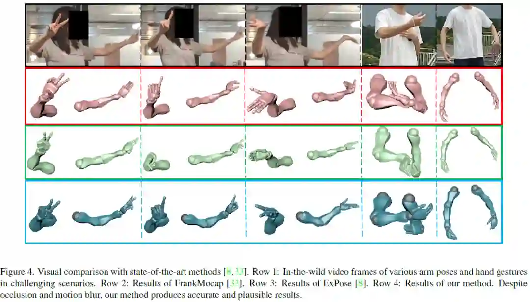 下图展示了论文方案和state-of-the-art算法的直观对比,第一行是一些包含识别难度较高的手部动作的视频帧,第二行是FrankMocap的结果,第三行是ExPose的结果,最后一行是论文方案的结果。不难看出论文方案表现出了明显更佳的准确性和鲁棒性。