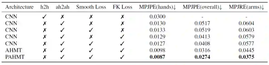 下表展示了消融实验的结果。结果显示,通过利用帧间相关性信息,普通Temporal Transformer表现出显著优于CNN的性能。而通过引入Spatial Transformer来利用手臂姿态和手势姿态之间的全局相关性以及不同关节点之间的局部相关性之后,实验误差继续显著降低(MPJPE降低13%,MPJRE降低16%)。对于目标函数,可以看出单独引入FK loss能够降低实验误差,而单独引入帧间平滑损失则于误差降低无益,这是因为帧间平滑损失的主要目标是提高输出的帧间连续性。但值得注意的是,当FK loss和帧间平滑损失结合使用时,实验误差比单独使用任意一种都更低。综上所述,实验验证了论文提出的并行时空transformer结构以及目标函数的有效性。