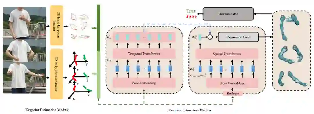 2.通过两个transformer模型分别在时间和空间维度上提取相关性信息,使得手臂和手部的相关性能够更好地被利用,与此同时也能输出帧间连续的结果;另外,论文还定制了合适的目标函数以获得准确而稳定的输出序列。