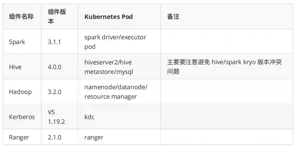 首先,我们必须要确定 Hive、Spark、Hadoop(HDFS)以及相关的 Kerberos、Ranger 的版本。对于 Spark 版本的选择,我们开发选型的时候最新版为 3.1.1,目前 Spark 最新版已经到了 3.2.1,Spark 选取最新版本即可,最新版本能够增强对 Kubernetes 的支持。而 Hive 版本选取的主要原则,即查看 Spark-client 模块的代码是否支持 Kubernetes,如果不支持是否容易改造以便支持。而 4.0.0 版本开始,spark-client 模块重构了代码结构,增加了 SparkClient 的抽象类,有该结构支持,增加对 Kubernetes 的支持就容易了很多。这里还有一种选择,就是 Hive 选用 3.1.2 的稳定版本,然后把最新的 master 分支的 spark-client 模块代码 cherry pick 到 3.1.2 版本即可。