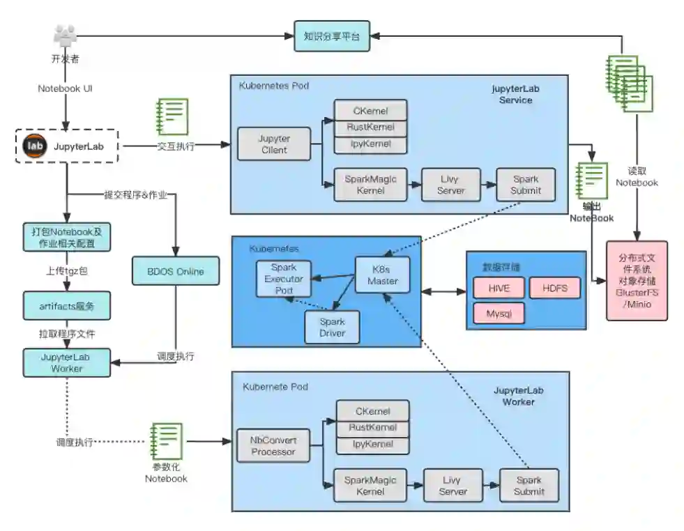 除了从命令行提交 Spark 任务,智领云使用 Hive 和 Spark 相关的业务还有三个场景:第一个、用户创建 Hive 作业进行数据 ETL 任务开发或数仓分层计算工作流创建。第二个、用户应用程序(例如,批处理调度系统)提交 pySpark 文件或者 Spark jar 包到平台,进行数据计算。第三个、用户使用 Jupyterlab Spark kernel 来访问 Hive/Mysql/Hdfs/Glusterfs 等数据源文件进行数据探索、机器学习及人工智能算法开发。这三种场景下的共同点都是需要将计算任务转换成 Spark job 在集群中调度运行(Hive 的缺省引擎已经从 MR 变成了 Spark)。在每个场景下,我们都在 Spark on Kubernetes 的基础上提供了相应的解决方案:
