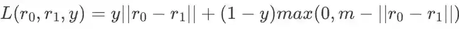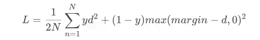 上图是 loss 与样本特征的欧式距离 d 之间的关系,其中红色虚线表示的是相似样本的损失值,蓝色实线表示的不相似样本的损失值。