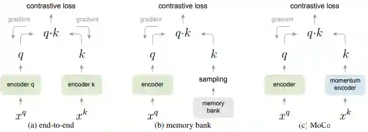 end-to-end:先编码 encoder(可同可不同),然后内积算 loss 再梯度。但是这种方法由于 dictionary size 和 mini-batch 的强耦合性(负例样本对也会为 loss 产生贡献,也会回传梯度),在 batch 大的时候优化难,而在 batch 小的时候,batch 之间的参数会不一样,也就是 GPU 大小限制了模型的性能。