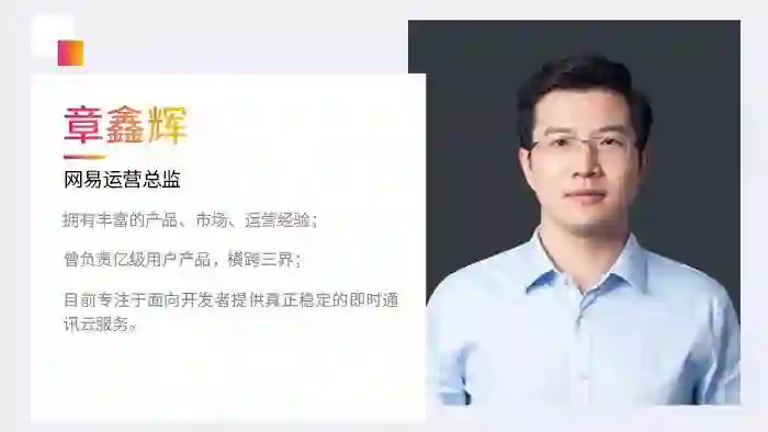 第二位,是拥有丰富的产品、市场、运营经验;曾负责亿级用户产品,横跨三界,目前专注于面向开发者提供真正稳定的即时通讯云服务的网易运营总监章鑫辉。