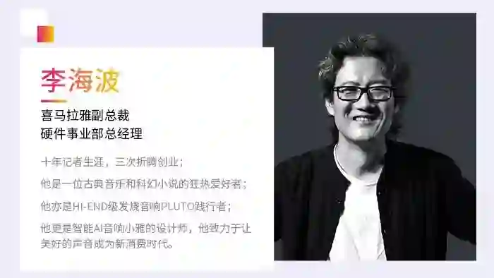 电影《可可西里》编剧、智能AI音响小雅的设计师,致力于让美好的声音成为新消费时代生活方式的喜马拉雅副总裁李海波;