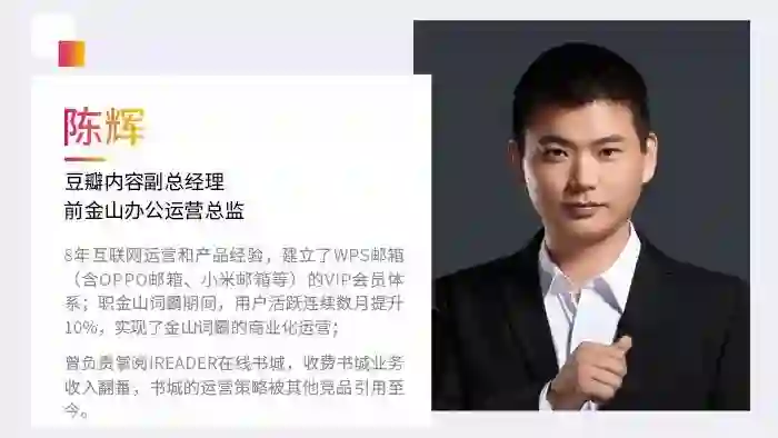 拥有多年互联网运营和产品经验,曾将张月收费书城业务翻番的豆瓣内容副总经理陈辉;