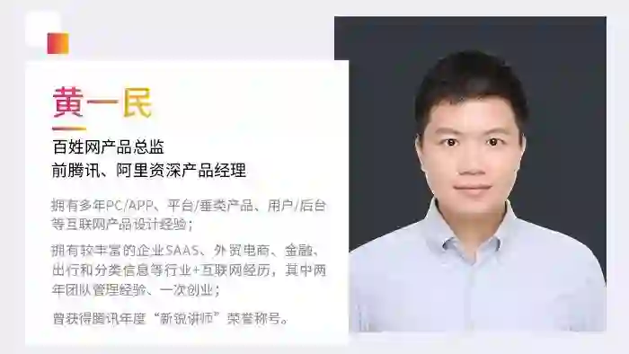 拥有多年PC/APP、平台/垂类产品经验,拥有较丰富的企业SAAS、外贸电商、金融、出行和分类信息等行业+互联网经历的百姓网产品总监黄一民;
