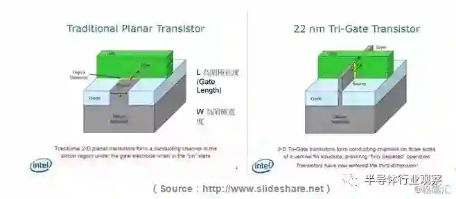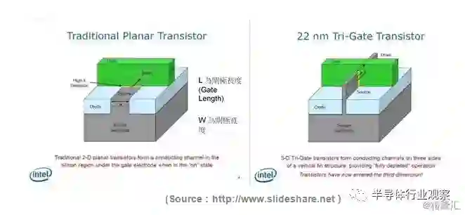 不过,制程并不能无限制的缩小,当我们将电晶体缩小到 20 纳米左右时,就会遇到量子物理中的问题,让电晶体有漏电的现象,抵销缩小 L 时获得的效益。作为改善方式,就是导入 FinFET(Tri-Gate)这个概念,如右上图。在 Intel 以前所做的解释中,可以知道藉由导入这个技术,能减少因物理现象所导致的漏电现象。