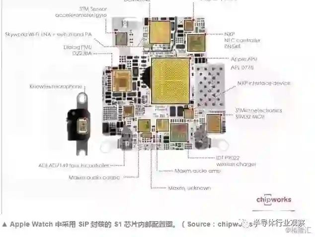 采用 SiP 技术的产品,最着名的非 Apple Watch 莫属。因为 Watch 的内部空间太小,它无法采用传统的技术,SoC 的设计成本又太高,SiP 成了首要之选。藉由 SiP 技术,不单可缩小体积,还可拉近各个 IC 间的距离,成为可行的折衷方案。下图便是 Apple Watch 芯片的结构图,可以看到相当多的 IC 包含在其中。