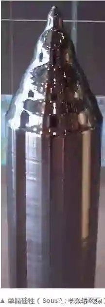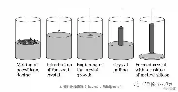 接着,就是拉晶的步骤。首先,将前面所获得的高纯度多晶硅融化,形成液态的硅。之后,以单晶的硅种(seed)和液体表面接触,一边旋转一边缓慢的向上拉起。至于为何需要单晶的硅种,是因为硅原子排列就和人排队一样,会需要排头让后来的人该如何正确的排列,硅种便是重要的排头,让后来的原子知道该如何排队。最后,待离开液面的硅原子凝固后,排列整齐的单晶硅柱便完成了。