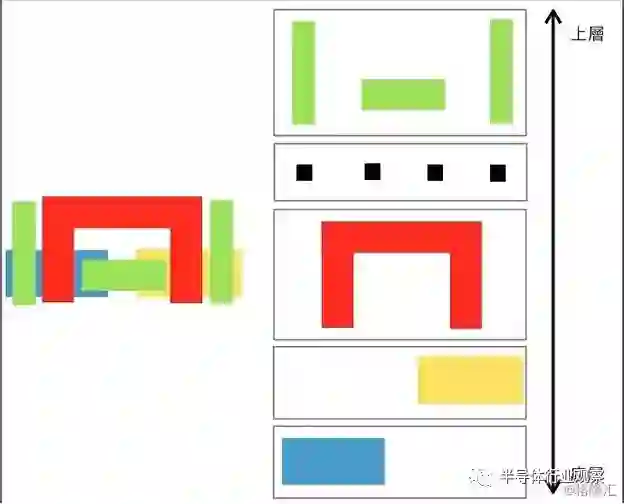 首先,目前已经知道一颗 IC 会产生多张的光罩,这些光罩有上下层的分别,每层有各自的任务。下图为简单的光罩例子,以积体电路中最基本的元件 CMOS 为范例,CMOS 全名为互补式金属氧化物半导体(Complementary metal–oxide–semiconductor),也就是将 NMOS 和 PMOS 两者做结合,形成 CMOS。至于什么是金属氧化物半导体(MOS)?这种在芯片中广泛使用的元件比较难说明,一般读者也较难弄清,在这里就不多加细究。