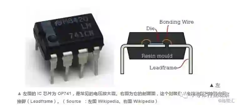 首先要介绍的是双排直立式封装(Dual Inline Package;DIP),从下图可以看到采用此封装的 IC 芯片在双排接脚下,看起来会像条黑色蜈蚣,让人印象深刻,此封装法为最早采用的 IC 封装技术,具有成本低廉的优势,适合小型且不需接太多线的芯片。但是,因为大多采用的是塑料,散热效果较差,无法满足现行高速芯片的要求。因此,使用此封装的,大多是历久不衰的芯片,如下图中的 OP741,或是对运作速度没那么要求且芯片较小、接孔较少的 IC 芯片。