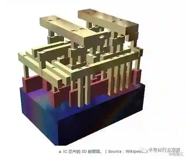 在开始前,我们要先认识 IC 芯片是什么。IC,全名积体电路(Integrated Circuit),由它的命名可知它是将设计好的电路,以堆叠的方式组合起来。藉由这个方法,我们可以减少连接电路时所需耗费的面积。下图为 IC 电路的 3D 图,从图中可以看出它的结构就像房子的樑和柱,一层一层堆叠,这也就是为何会将 IC 制造比拟成盖房子。