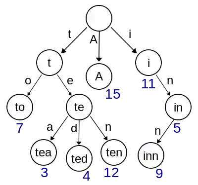 得到处理后的文本之后,我需要建立一个全文索引。这样是为了快速地查找原文内容,加速后面的计算。我使用了后缀树这个结构作为索引。这个数据结构比较复杂,所以我们可以先谈谈更简单的字典树。