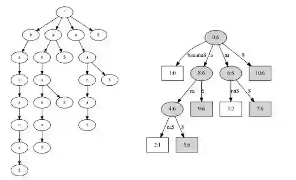 而后缀树和后缀字典树的区别就是,在后缀树中,我们要把下面只有一条边的结点去掉,然后把这个结点连接的两条边压缩成一条。比如,左图后缀字典树中的 b-a-n-a-n-a,在右图的后缀树中被压缩成了 banana 这一条边。此外,后缀树还使用了一个技巧,就是不储存边的内容,而是储存这些内容在原文中的位置。因为后缀树中的很多内容都是重复的,所以这个小技巧可以大大减少索引的大小(用专业的语言描述,它的空间复杂度是 O(n))。
