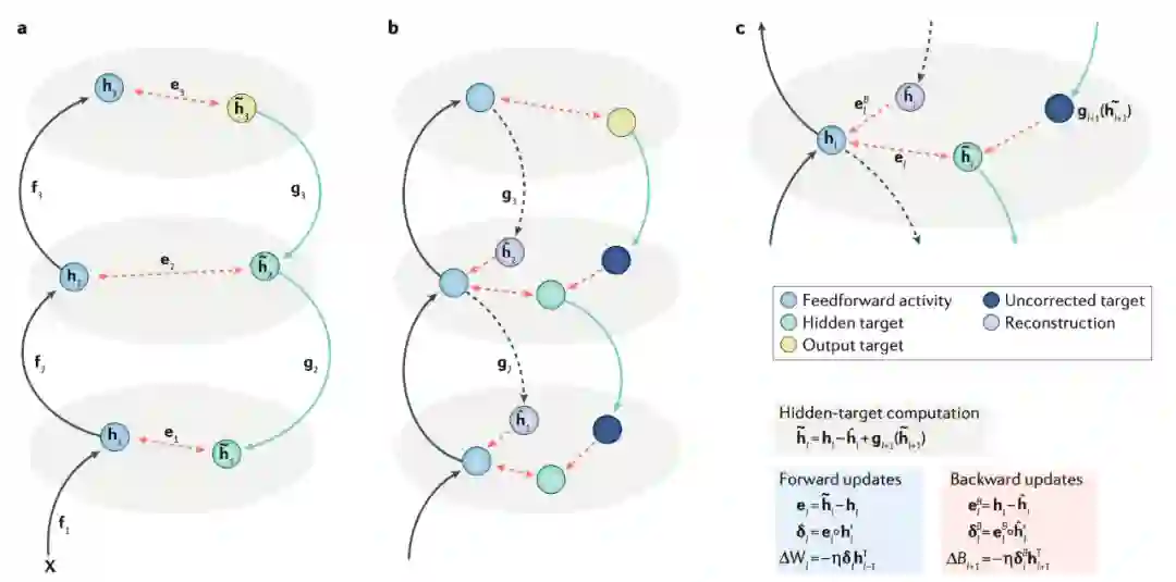 在计算机上,反向传播算法利用一组与前向传播所用活动变量完全不同的 error derivative 变量,向后传播误差信息。而将反向传播引入大脑中后,大脑中的误差信息可以通过不同的「误差传播网络」(error delivery network)进行传播,该反向网络的每一个神经元均携带前向网络中对应神经元的更新信息。