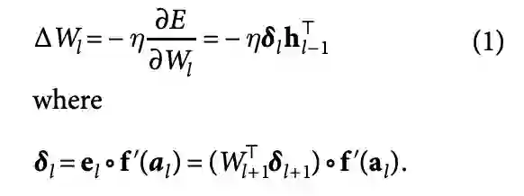 反向传播的朴素实现要求通过反向连接传播误差信号,而反向连接的强度必须与前向连接一致。从上文公式 1 中可以看到,误差 δ_l+1 沿着后向权重 W^⊤_l+1 移动,该后向权重与前向权重是对称的。