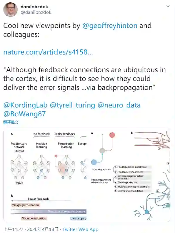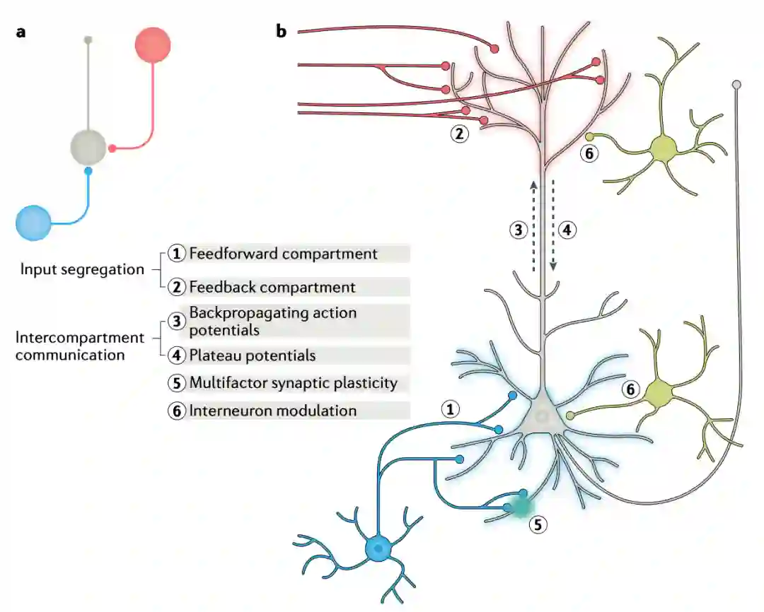 尽管如此,神经科学的最新发展和神经网络的成功激活了人们对反向传播能否帮助进一步了解皮层学习的兴趣。反向传播算法使用反向连接(feedback connection)传递误差信号,来计算突触更新,从而实现快速学习。尽管反向连接在皮层中无处不在,但我们很难观察到它们是如何传递反向传播所需误差信号的。