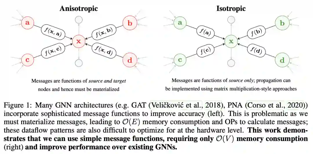此类模型遵循 GNN 架构设计的消息传递风格(由 Petar Veličković 推广),并且可以被认为是「各向异性的」,因为它们对每条边进行了不同的处理(而普通 GCN 是「各向同性的」,因为相同的可学习权重被应用于每条边)。然而,在每层的节点和边上维护隐空间嵌入会显著增加 GNN 的推理延迟和内存需求。