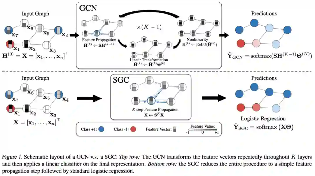 Wu 等人的简化图卷积网络(SGC)是第一个提出这个想法的工作。SGC 本质上是由 Kipf 和 Welling 通过将(昂贵但非学习的)稀疏邻域特征聚合步骤与(廉价且可学习的)线性投影解耦,然后用 ReLU 非线性步骤来 “解构” 普通 GCN。在处理大型图时,可以在 CPU 上高效地预先计算特征聚合(CPU 在处理稀疏操作方面表现不错),然后可以对 “结构增强” 节点特征进行批处理并传递给在 GPU 上训练的 MLP。