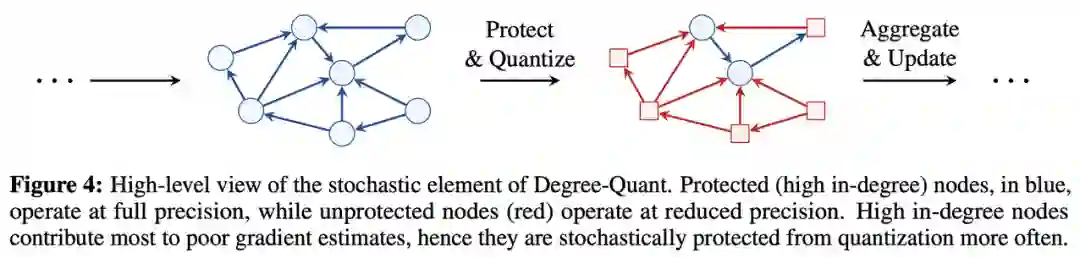 Tailor 等人的 DegreeQuant 提出了一种专门用于 GNN 的 QAT 技术。为计算机视觉 CNN 设计的通用 QAT 在应用于 GNN 时通常会导致量化后的性能非常差。DegreeQuant 旨在通过巧妙地将基础数据的图结构整合到量化过程中来缓解这一问题:他们表明,具有许多邻居(度数较高)的节点会导致 QAT 期间的不稳定,并建议在执行 QAT 时随机屏蔽度数较高的节点。与 FP32 模型相比,这为 GNN 提供了更稳定的 QAT,并最大限度地减少了 INT8 的性能下降。