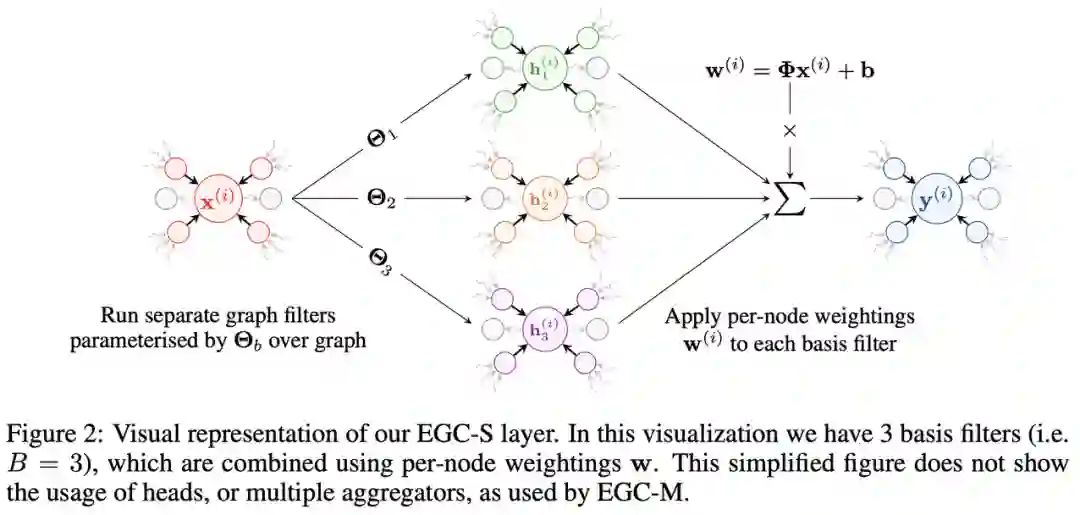 Tailor 等人的高效图卷积 (EGC) 试图解决这个困境。他们从基本的 GCN 设计开始(对于批量中等大小的图具有良好的可扩展性),并设计了一个最大表达的卷积 GNN 版本,同时保留了 GCN 的可扩展性。令人印象深刻的是,它们在 Open Graph Benchmark 的图分类任务中优于更复杂和繁琐的基准模型。
