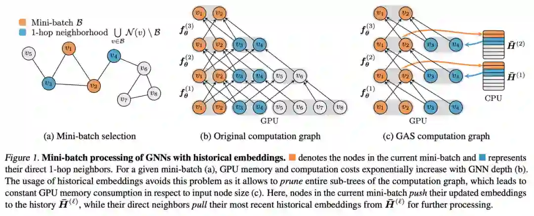 GAS 框架有两个主要组成部分:首先,第一部分是构建一个小批量节点(执行快速随机子采样)并修剪 GNN 计算图以仅保留小批量内的节点及其 1 跳邻居节点——这意味着 GAS 的尺度独立于 GNN 深度。其次,每当 GNN 聚合需要小批量节点嵌入时,GAS 就会从存储在 CPU 上的历史嵌入中检索它们。同时,当前小批量节点的历史嵌入也不断更新。