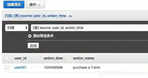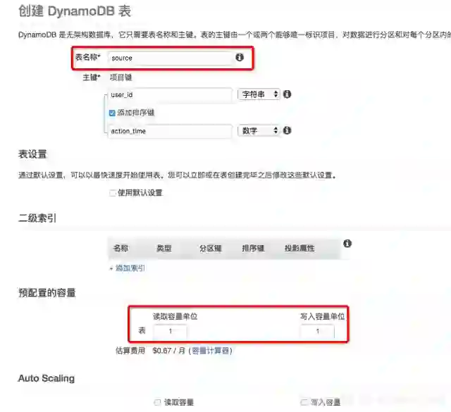 我们以表Source为例,主键为user_id(字符串类型),排序键为action_time(数字)。由于DynamoDB的预留设置会影响读写的并发,故需要注意预留的设置。