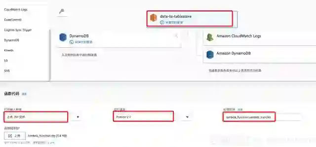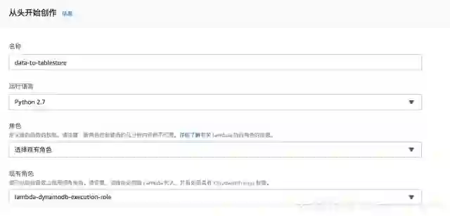实例函数名称为:data-to-table, 运行语言选择为 Python 2.7,使用 lambda-dynamodb-execution-role的角色。