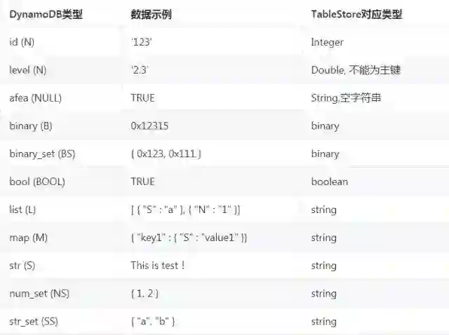 DynamoDB 中表的主键同TableStore中的主键保持一致,且数字类型的主键只能为整型。