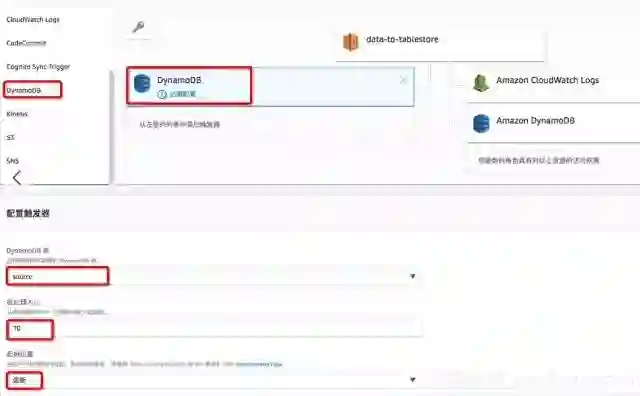 点击事件源的DynamoDB图标,进行事件源配置,选择 source 数据表批处理大小先选择为10进行小批量验证,在实际运行过程中建议为100,由于表格存储的Batch操作最大为200条数据,故不能超过200。