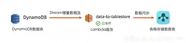 我们使用DynamoDB的Stream数据流获取DynamoDB表中的增删改操作,将操作同步到表格存储中,为了避免环境搭建,将同步程序运行在Lambda 中,流程如下图:
