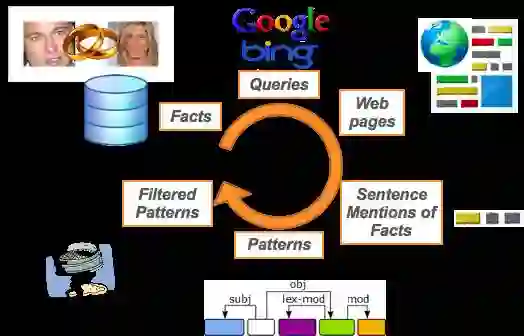 和其他人一样,我们从语言处理监督学习研究人员先前提出的事实开始着手,最早的是斯坦福大学研究人员发表的论文。我们怎么做的?其实跟他们不太一样,我等会在向你们说明。我们获取了数千个事实,然后在谷歌搜索引擎上进行搜索,在得出的搜索结果网页中,把句子断句之后确定句子的相依性,然后通过复杂的模式提取机制进行提取,刚开始的时候这种机制并不理想,许多机构在这里败下来,因为这种机制通常只能适用于短句、断句的语意分析。我们使用了语义知识图谱,例如Wordnet,用其中的资源进行过滤以确保提取出的内容具有语义上的模式。