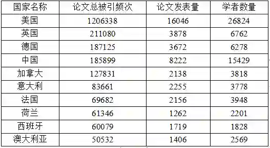 论文总被引频次最高的国家是美国,其次是英国和德国等欧洲国家,中国排名全球第 4。相比英国和德国,中国的学者数量和论文发表量较高,但是论文总被引频次偏低。